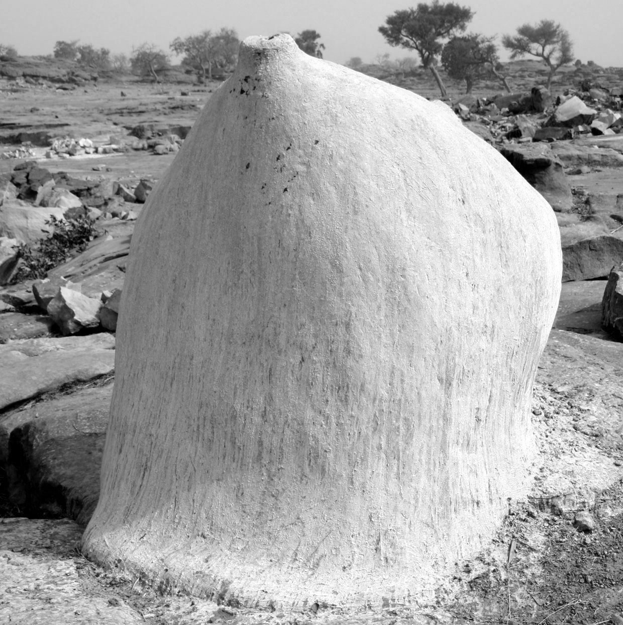 Sangha Ogol Ley autel du Mono : La communication avec l'au-delà se fait par le biais de sacrifices sur des autels. L’autel du Mono est une structure en banco située à la périphérie du village. Il est le gardien qui protège le monde habité des hommes contre les forces surnaturelles de la brousse sauvage. Si une épidémie telle que la rougeole sévit dans les régions alentour, alors c’est au Mono d’empêcher la maladie de pénétrer dans le village. Le rituel du Mono est lié aux célébrations du Gorou qui ont lieu en début d'année. Les garçons vierges du village se présentent tout d’abord au Wagem (autel des ancêtres) de leur Ginna respectif. La nuit venue, armés de crosses en bois (Domolo), ils rejoignent le Mono et allument un feu. Le son de leurs cris s’entend de loin. Sur place ils écrasent du riz et du mil, en font une pâte avec laquelle ils blanchissent le Mono. A son pied, ils préparent une grosse galette de mil qu’ils coupent en tranches. Chaque famille en recevra une part. Cette nuit, quand les jeunes sont occupés au Mono, les villageois ne s’aventurent pas hors de leur maison. Le rituel du Mono permet de purger le village de ses conflits et de balayer les discordes accumulées au cours de l’année. Le partage de la galette correspond à un élan de solidarité qui unit les habitants d’un même village et permet d’entamer la nouvelle année sous de bons auspices. |